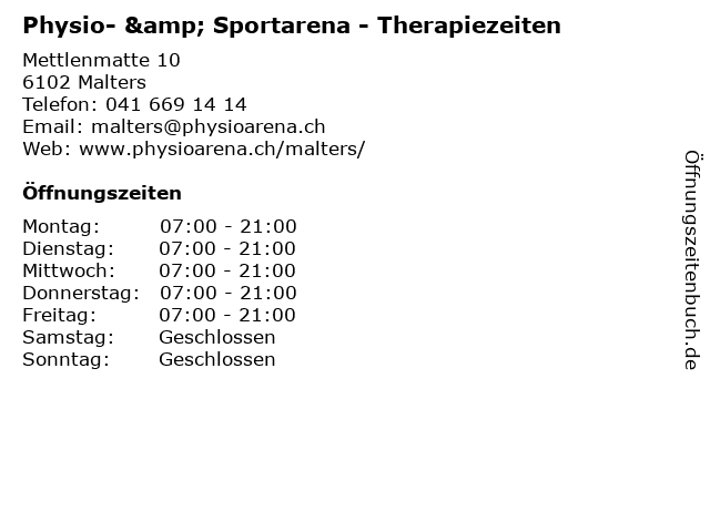 Öffnungszeiten Physio- & Sportarena - Therapiezeiten in Malters anzeigen