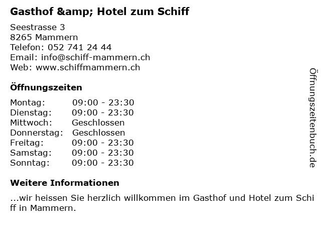 | Öffnungszeiten Gasthof & Hotel zum Schiff in Mammern anzeigen | |