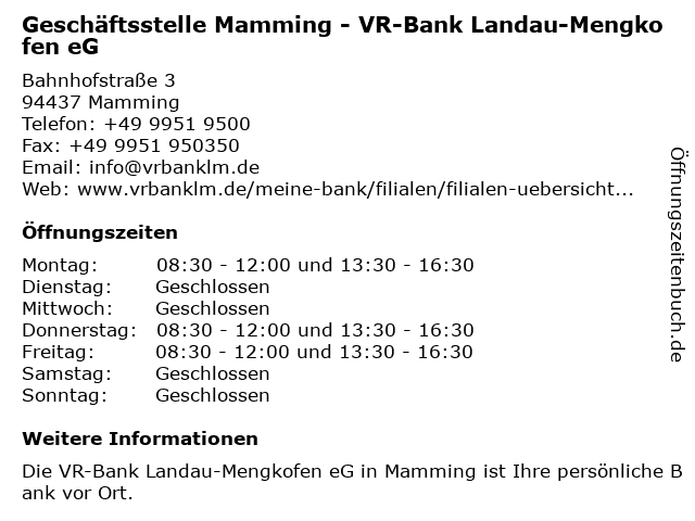 Branchen & Suchbegriffe zu Geschäftsstelle Mamming - VR-Bank Landau-Mengkofen eG:altersvorsorge, bank, baufinanzierung, bausparen, eg, geldanlage, geldautomat, geschäftsstelle, girokonto, kontoauszugsdrucker, kredit, mamming, mengkofen, vr |