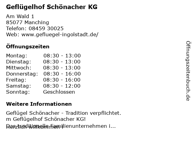 | Öffnungszeiten Geflügelhof Schönacher KG in Manching anzeigen | |