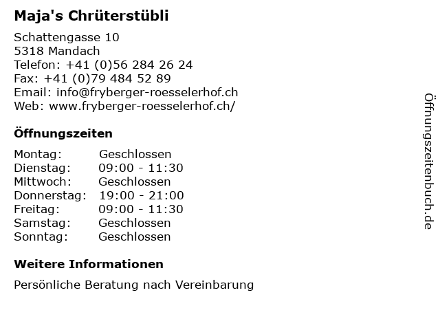 | Öffnungszeiten Maja's Chrüterstübli in Mandach anzeigen | |
