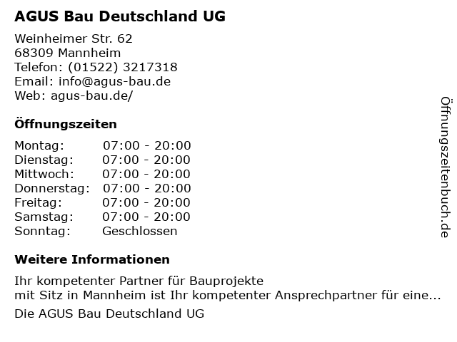 | Öffnungszeiten AGUS Bau Deutschland UG in Mannheim anzeigen | |
