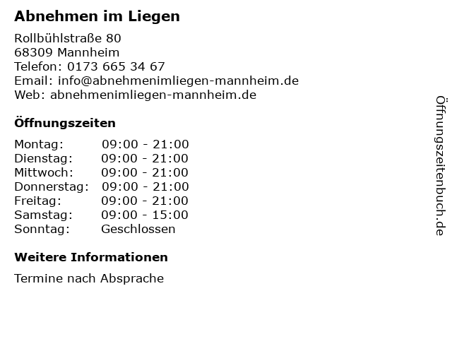 | Öffnungszeiten Abnehmen im Liegen in Mannheim anzeigen | |