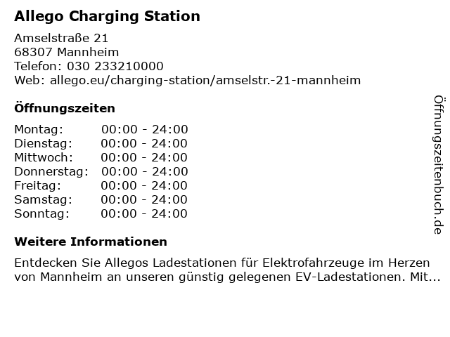 | Öffnungszeiten Allego Charging Station in Mannheim anzeigen | |