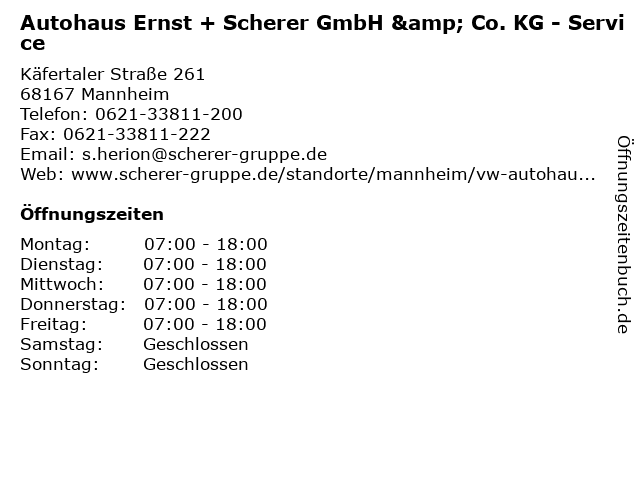 1 Autohaus Ernst + Scherer GmbH & Co. KG - Service (Entfernung: 0,18 km) Friedrich-Ebert-Straße 86, 68167 Mannheim 2 Autohaus Ernst - Gebrauchtwagenverkauf (Entfernung: 0,00 km) Käfertaler Straße 261-263, 68167 Mannheim 5 landart - mit Freude entdecken Priska Scherer (Entfernung: 0,41 km) Friedrich-Ebert-Straße 48, 68167 Mannheim 6 |