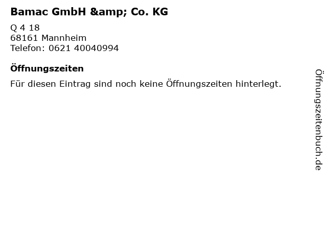 | Öffnungszeiten Bamac GmbH & Co. KG in Mannheim anzeigen | |