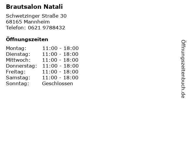 | Öffnungszeiten Brautsalon Natali in Mannheim anzeigen | |