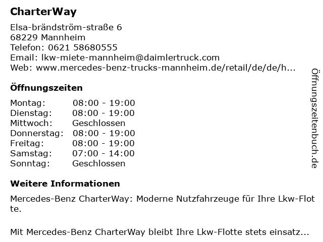 | Öffnungszeiten CharterWay in Mannheim anzeigen | |