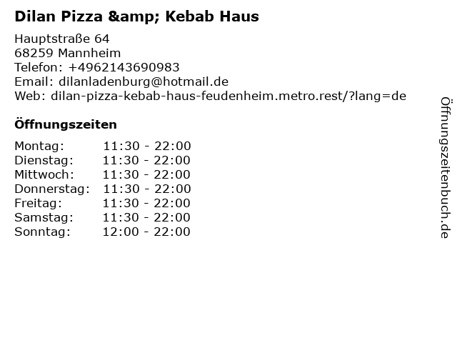 | Öffnungszeiten Dilan Pizza & Kebab Haus in Mannheim anzeigen | |