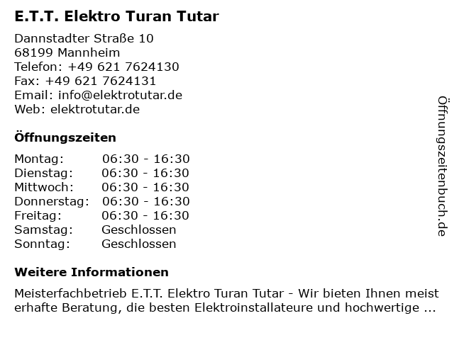 | Öffnungszeiten E.T.T. Elektro Turan Tutar in Mannheim anzeigen | |