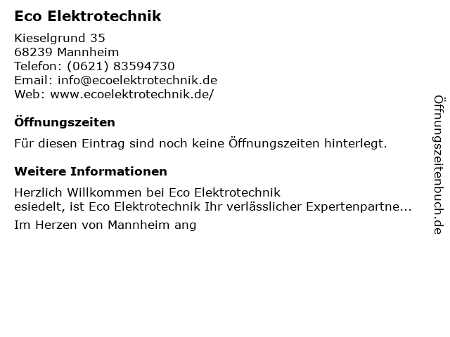 | Öffnungszeiten Eco Elektrotechnik in Mannheim anzeigen | |
