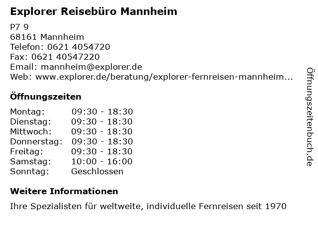 | Öffnungszeiten Explorer Reisebüro Mannheim in Mannheim anzeigen | |