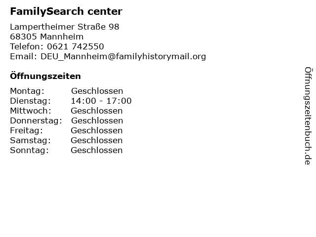 | Öffnungszeiten FamilySearch center in Mannheim anzeigen | |