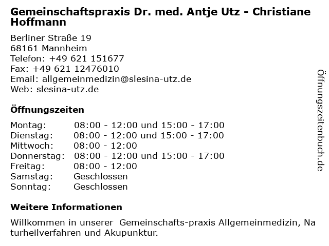1 Gemeinschaftspraxis Dr. med. Stefanie Slesina Dr. med. Antje Utz (Entfernung: 0,00 km) Berliner Straße 19, 68161 Mannheim 6 |