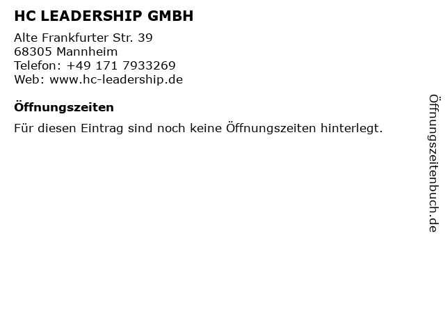 | Öffnungszeiten HC LEADERSHIP GMBH in Mannheim anzeigen | |