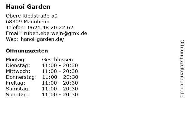 | Öffnungszeiten Hanoi Garden in Mannheim anzeigen | |