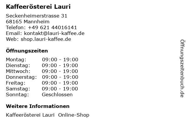 | Öffnungszeiten Kaffeerösterei Lauri in Mannheim anzeigen | |