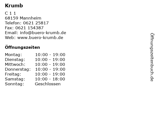 | Öffnungszeiten Krumb in Mannheim anzeigen | |