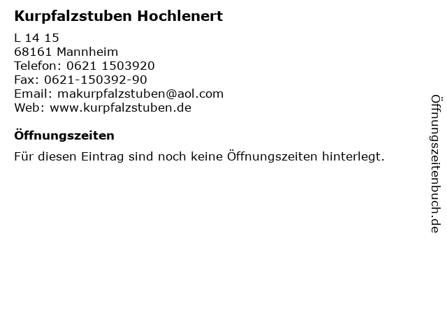 | Öffnungszeiten Kurpfalzstuben Hochlenert in Mannheim anzeigen | |