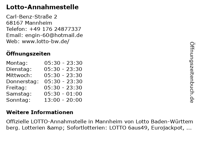 | Öffnungszeiten Lotto-Annahmestelle in Mannheim anzeigen | |