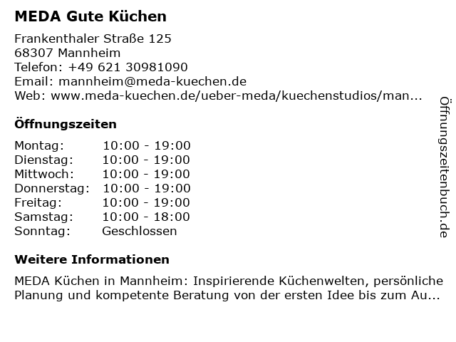 | Öffnungszeiten MEDA Gute Küchen in Mannheim anzeigen | |