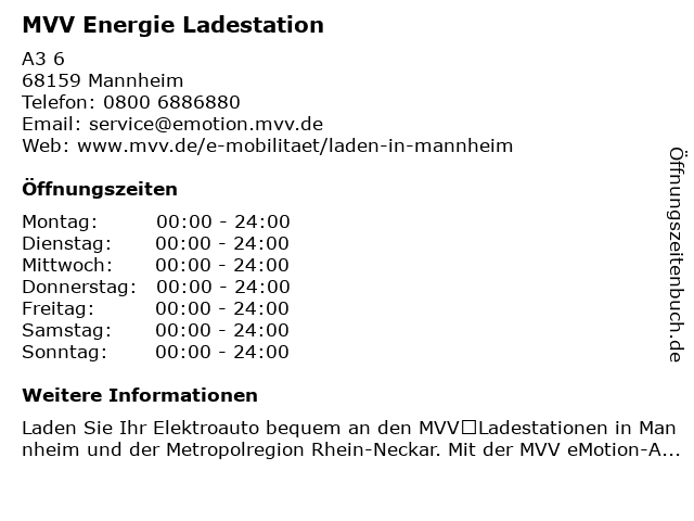 | Öffnungszeiten MVV Energie Ladestation in Mannheim anzeigen | |