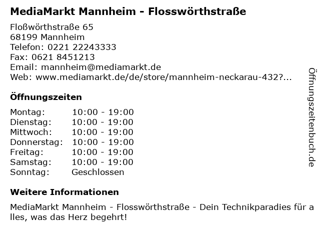 Branchen & Suchbegriffe zu MediaMarkt Mannheim - Flosswörthstraße:anbieter für telekommunikationsgeräte, computergeschäft, flosswörthstraße, geschäft für handyzubehör, geschäft für heimaudiosysteme, geschäft für videospiele, handyreparaturgeschäft, haushaltsgeräte, mediamarkt, mobiltelefongeschäft |