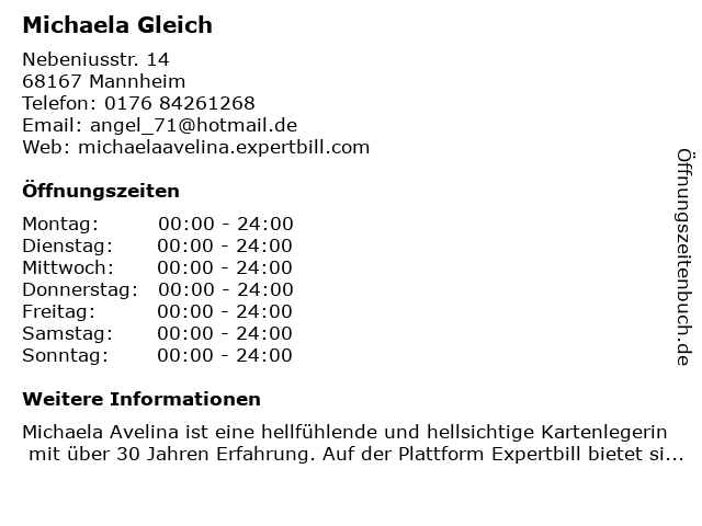 | Öffnungszeiten Michaela Gleich in Mannheim anzeigen | |