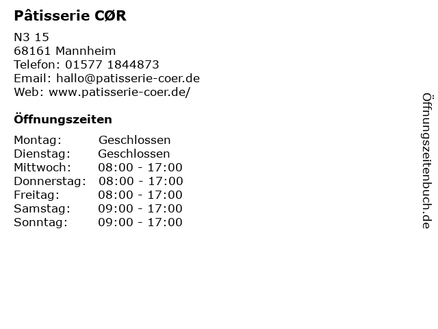 | Öffnungszeiten Pâtisserie CØR in Mannheim anzeigen | |
