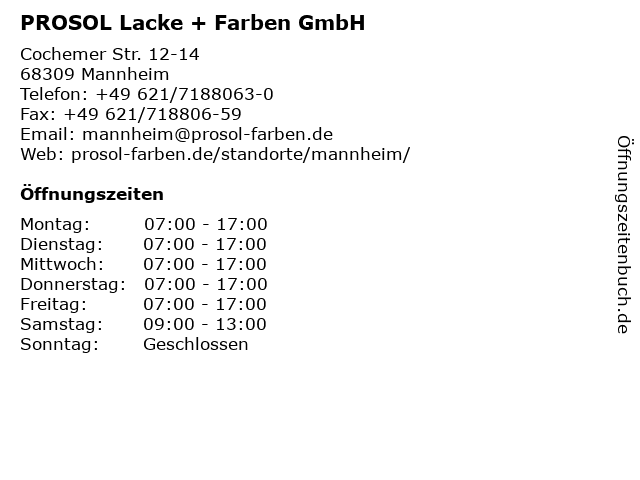 | Öffnungszeiten PROSOL Lacke + Farben GmbH in Mannheim anzeigen | |