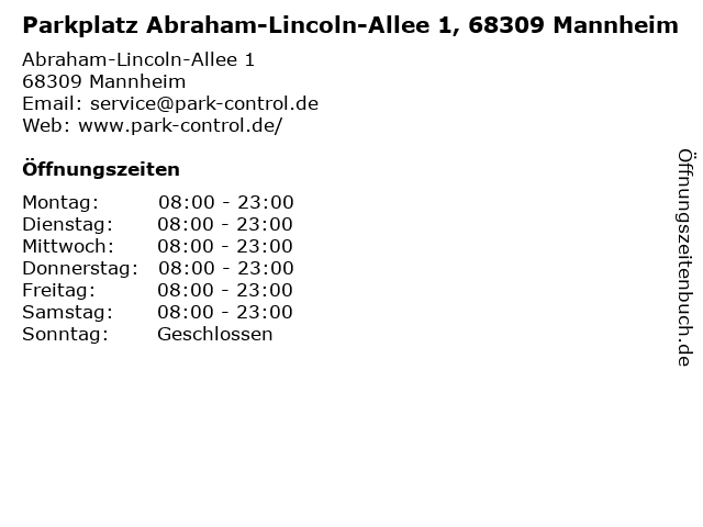 Öffnungszeiten Parkplatz Abraham-Lincoln-Allee 1, 68309 Mannheim in Mannheim anzeigen | |