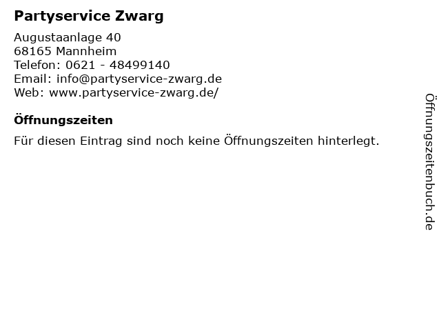 | Öffnungszeiten Partyservice Zwarg in Mannheim anzeigen | |