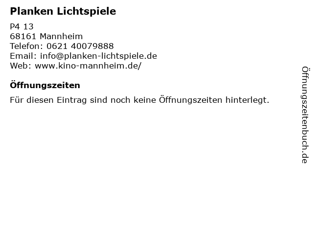Öffnungszeiten Planken Lichtspiele in Mannheim anzeigen | |