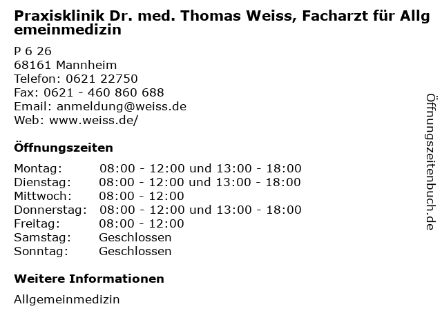 Branchen & Suchbegriffe zu Praxisklinik Dr. med. Thomas Weiss, Facharzt für Allgemeinmedizin:allgemeinmedizin, allgemeinmedzin, arzt, dr., facharzt, med., praxisklinik, sprechzeiten, thomas, weiss |