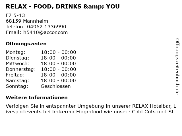 | Öffnungszeiten RELAX - FOOD, DRINKS & YOU in Mannheim anzeigen | |