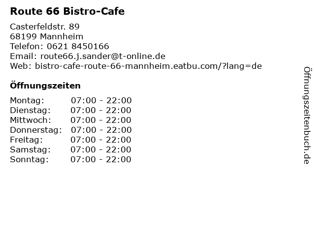 | Öffnungszeiten Route 66 Bistro-Cafe in Mannheim anzeigen | |