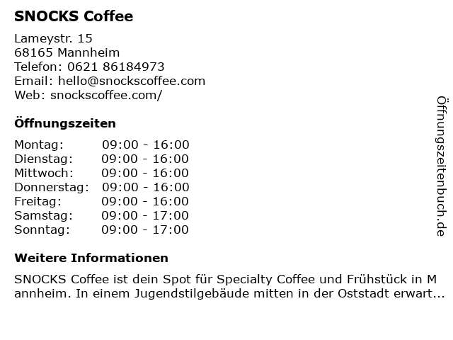| Öffnungszeiten SNOCKS Coffee in Mannheim anzeigen | |