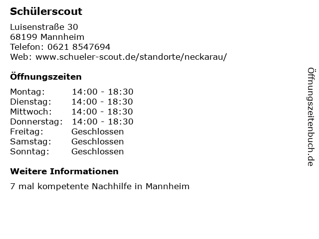 | Öffnungszeiten Schülerscout in Mannheim anzeigen | |