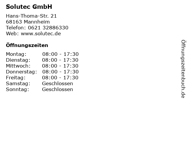 | Öffnungszeiten Solutec GmbH in Mannheim anzeigen | |