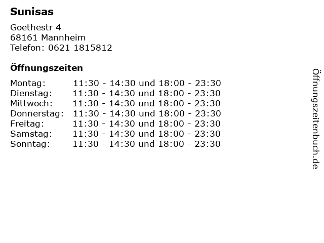 | Öffnungszeiten Sunisas in Mannheim anzeigen | |