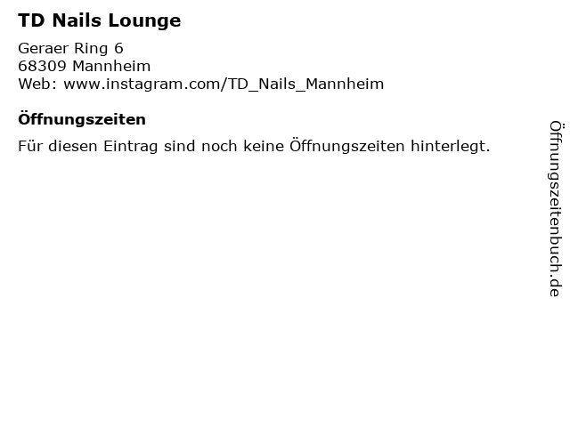 | Öffnungszeiten TD Nails Lounge in Mannheim anzeigen | |