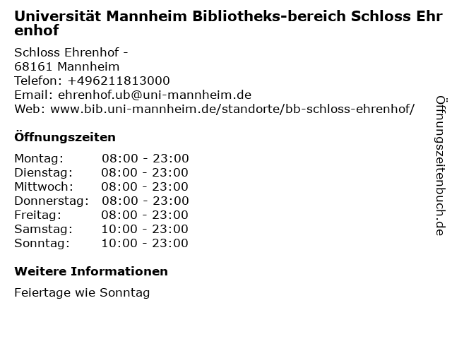 1 Universität Mannheim Bibliotheksbereich Schloss Schneckenhof (Entfernung: 0,17 km) Bismarckstraße 42, 68161 Mannheim 4 Universität Mannheim Universitätsbibliothek (Entfernung: 0,23 km) Schloss Westflügel -, 68161 Mannheim 6 |