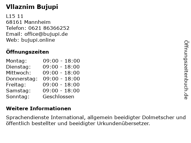 | Öffnungszeiten Vllaznim Bujupi in Mannheim anzeigen | |