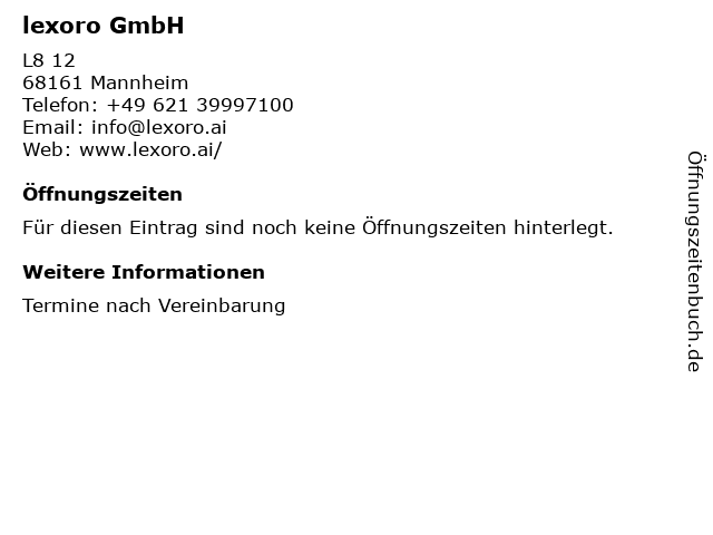 | Öffnungszeiten lexoro GmbH in Mannheim anzeigen | |