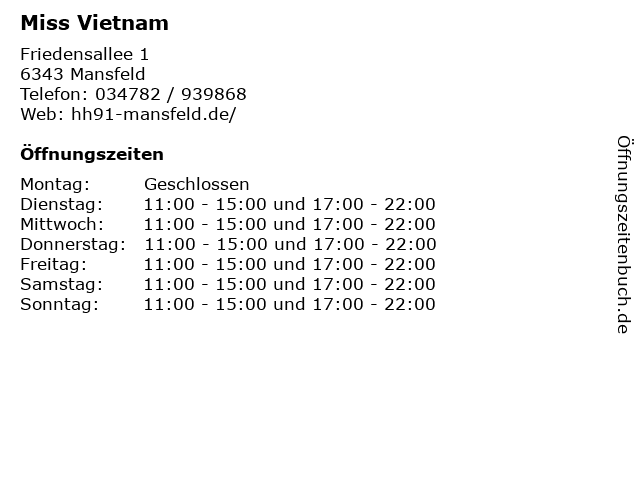 | Öffnungszeiten Miss Vietnam in Mansfeld anzeigen | |