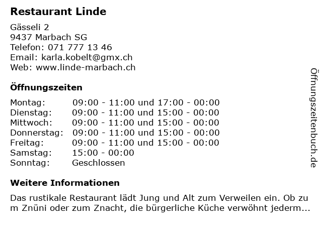 | Öffnungszeiten Restaurant Linde in Marbach SG anzeigen | |