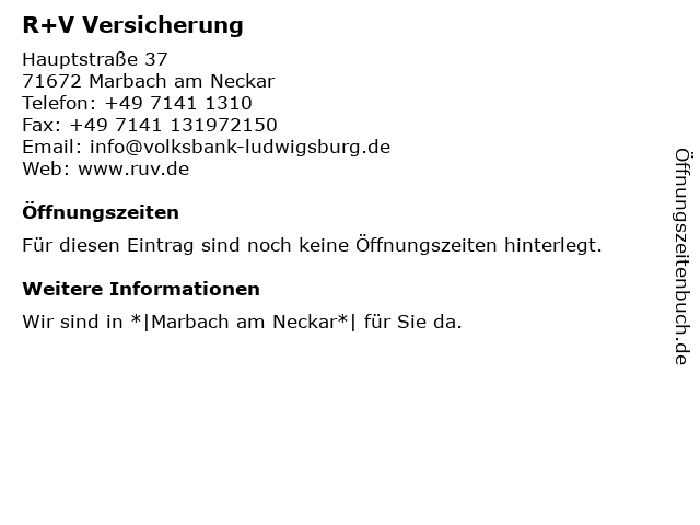 | Öffnungszeiten R+V Versicherung in Marbach am Neckar anzeigen | |