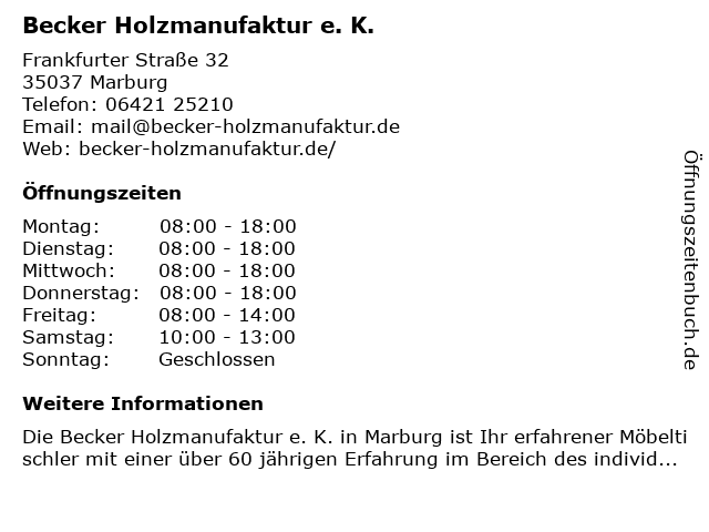 | Öffnungszeiten Becker Holzmanufaktur e. K. in Marburg anzeigen | |