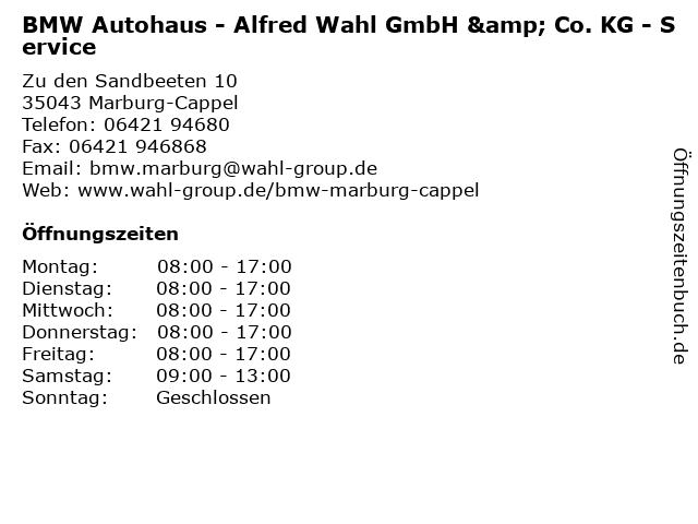 | 1 BMW Autohaus - Alfred Wahl GmbH & Co. KG - Verkauf (Entfernung: 0,00 km) Zu den Sandbeeten 10, 35043 Marburg-Cappel 2 BMW Autohaus - Alfred Wahl GmbH & Co. KG - Teile und Zubehör (Entfernung: 0,00 km) Zu den Sandbeeten 10, 35043 Marburg-Cappel 4 BMW Autohaus - Alfred Wahl GmbH & Co. KG - Verkauf (Entfernung: 16,59 km) Talstraße 19, 35232 Dautphetal-Holzhausen 5 BMW Autohaus - Alfred Wahl GmbH & Co. KG - Teile und Zubehör (Entfernung: 16,59 km) Talstraße 19, 35232 Dautphetal-Holzhausen 6 BMW Autohaus - Alfred Wahl GmbH & Co. KG - Service (Entfernung: 16,59 km) Talstraße 19, 35232 Dautphetal-Holzhausen |