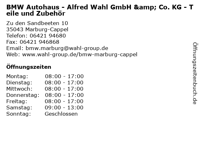 1 BMW Autohaus - Alfred Wahl GmbH & Co. KG - Service (Entfernung: 0,00 km) Zu den Sandbeeten 10, 35043 Marburg-Cappel 2 BMW Autohaus - Alfred Wahl GmbH & Co. KG - Verkauf (Entfernung: 0,00 km) Zu den Sandbeeten 10, 35043 Marburg-Cappel 4 BMW Autohaus - Alfred Wahl GmbH & Co. KG - Verkauf (Entfernung: 16,59 km) Talstraße 19, 35232 Dautphetal-Holzhausen 5 BMW Autohaus - Alfred Wahl GmbH & Co. KG - Teile und Zubehör (Entfernung: 16,59 km) Talstraße 19, 35232 Dautphetal-Holzhausen 6 BMW Autohaus - Alfred Wahl GmbH & Co. KG - Service (Entfernung: 16,59 km) Talstraße 19, 35232 Dautphetal-Holzhausen |